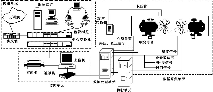 TZJX系列煤礦主要通風機在線監測系統能根據風量監測裝置、瓦斯濃度檢測裝置、風機故障檢測裝置采集到的風量大小、瓦斯濃度和故障信號通過可編程控制器、工控機、變頻器、接觸器實時顯示通風機的運行狀況。當運轉的風機出現故障時,能停止故障風機,發出故障報警信號。需要切換備用通風機時,系統能自動檢測備用風機狀態并打印出審批報表,經審批通過后可實現自動或手動切換。能對礦井總回風巷的風速進行監測,在礦井需要反向送風時能快速反向送風,確保礦山安全生產。